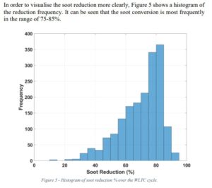 Steady state tests conducted at various engine operating points across the speed and load range revealed soot reductions in the range of 63.7% to 83.9% and an average reduction across all operating points of 78%. Hot WLTC drive cycle tests demonstrated a significant reduction in particulate emissions throughout the cycle, typically in the range of 40-90% with an average reduction of 70%. Particulate size and distribution tests showed that the device achieves consistent reduction efficiency across the particulate size range, with reductions in the region of 85 – 95%. Soot particle size was found to have very little impact on the soot reduction efficiency.