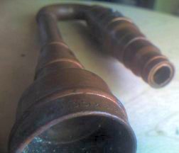 The rest of the jet is made from standard copper plumbing adaptors. The combustion chamber is the only modified part. It is made from two adaptors that are used to connect a small diameter pipe to a larger one. These are cut shorter and soldered end to end. The main drawback of this is that the solder will melt and the device will fail (or even explode) after a short time.