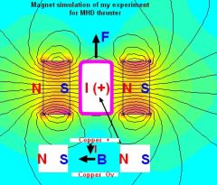 This type of thruster generates magnetic fields by passing an electric current through a liquid conductor, such as sea water. Using another magnetic field, the liquid can be pushed in a chosen direction, therefore generating thrust. You can easily make one of these devices from household materials and a couple of neodymium magnets. In the diagram below the small arrows represent the intersecting electric and magnetic fields. the large blue arrow represents the flow of water.